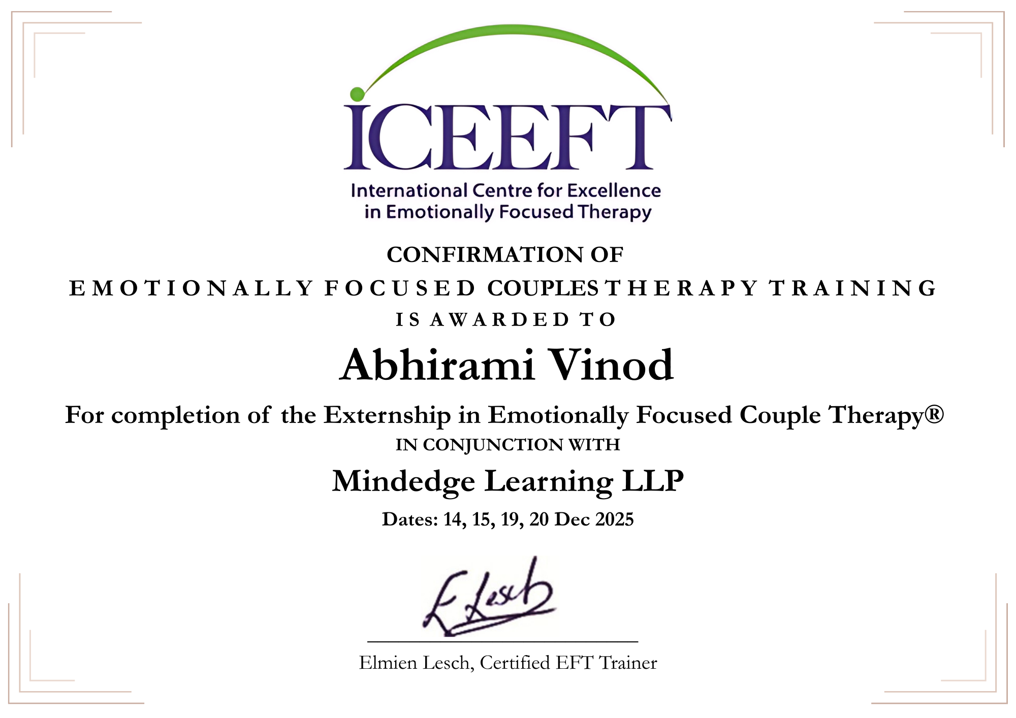 I am a Trauma-Informed Counselling Psychologist, Program Consultant, and Wellness Coach with experience across corporate and private practice settings. I work with adults, adolescents, and couples, offering a client-centered and integrative approach that prioritizes safety, collaboration, and emotional understanding. Having completed the Emotionally Focused Therapy (EFT) Externship, I bring an attachment-based lens to my work with couples, supporting them in identifying emotional patterns, deepening communication, and fostering more secure and meaningful connections. My work also extends to supporting individuals through grief, complex loss, anxiety, stress, and life transitions. I focus on helping clients build insight into their inner experiences while gently guiding them towards practical and sustainable change in their everyday lives.
